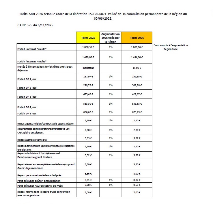 Tarifs restauration et hébergement